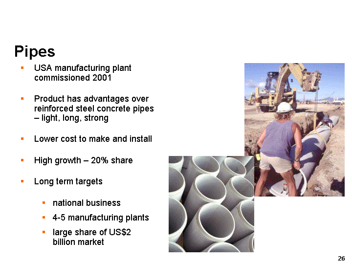 | USA manufacturing plant commissioned 2001 Product has advantages over reinforced steel concrete pipes - - light, long, strong Lower cost to make and install High growth - 20% share Long term targets national business 4-5 manufacturing plants large share of US$2 billion market Pipes |