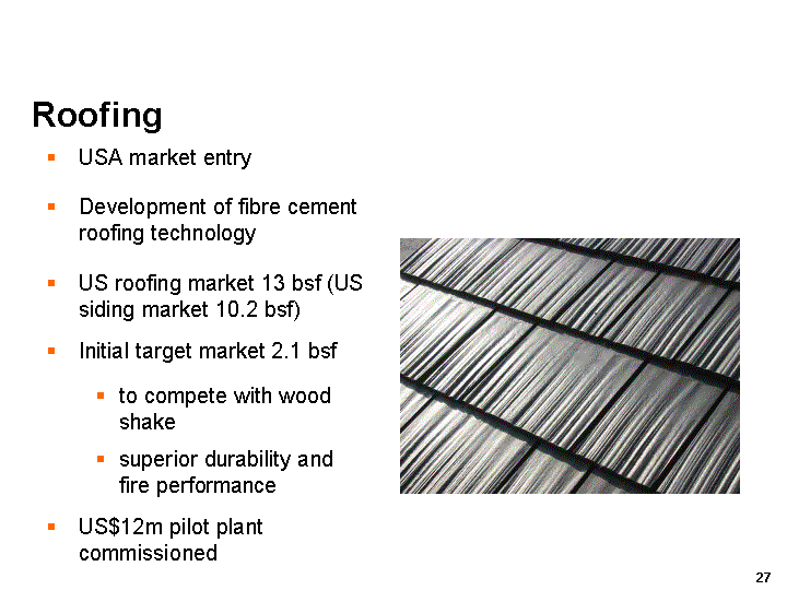 | Roofing USA market entry Development of fibre cement roofing technology US roofing market 13 bsf (US siding market 10.2 bsf) Initial target market 2.1 bsf to compete with wood shake superior durability and fire performance US$12m pilot plant commissioned |