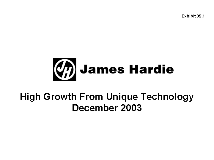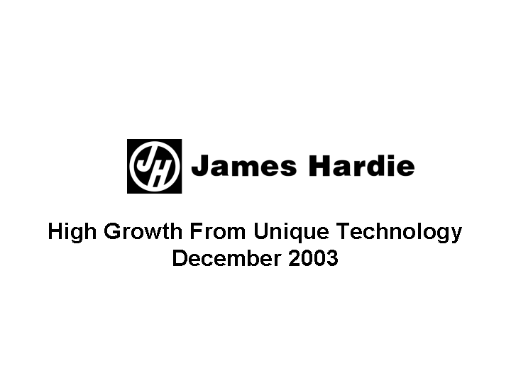 | Balanced Growth Portfolio James Hardie Business Portfolio - FY 03 GCE Sales EBIT1 USA - - Established high growth/high return 70% 75% 89% Asia Pacific - - Established high return 21% 24% 17% Other - - Emerging opportunities (Pipes, Roofing, Europe, Chile) 9% 1% (6%) Total 100% 100% 100% |