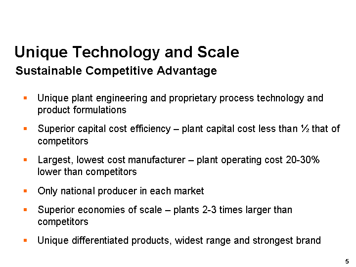 | Unique Technology and Scale Sustainable Competitive Advantage Unique plant engineering and proprietary process technology and product formulations Superior capital cost efficiency - plant capital cost less than 1/2 that of competitors Largest, lowest cost manufacturer - plant operating cost 20-30% lower than competitors Only national producer in each market Superior economies of scale - plants 2-3 times larger than competitors Unique differentiated products, widest range and strongest brand |