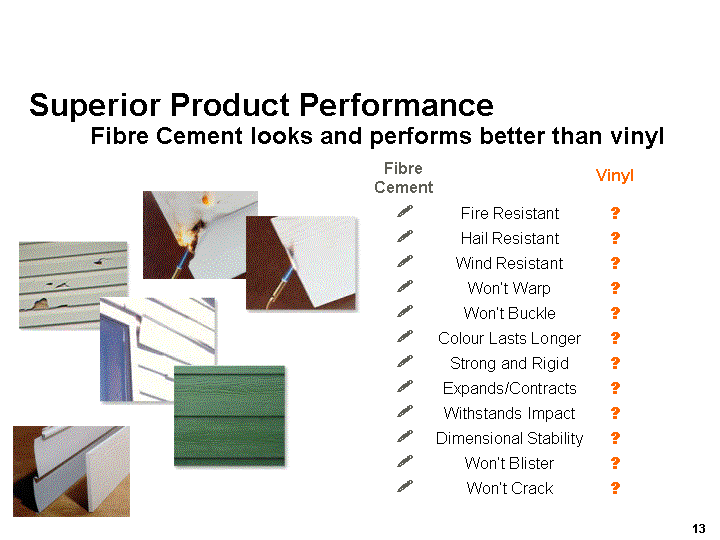 | Superior Product Performance Fibre Cement looks and performs better than vinyl Vinyl Fire Resistant Hail Resistant Wind Resistant Won't Warp Won't Buckle Colour Lasts Longer Strong and Rigid Expands/Contracts Withstands Impact Dimensional Stability Won't Blister Won't Crack ? ? ? ? ? ? ? ? ? ? ? ? ? ? ? ? ? ? ? ? ? ? ? ? Fibre Cement |