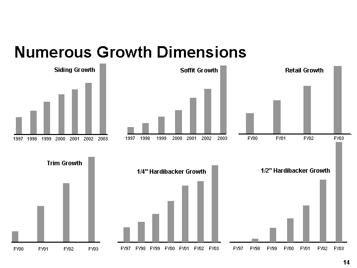 | Soffit Growth 1997 1998 1999 2000 2001 2002 2003 FY00 FY01 FY02 FY03 Retail Growth 1997 1998 1999 2000 2001 2002 2003 Siding Growth Trim Growth FY00 FY01 FY02 FY03 Numerous Growth Dimensions 1/4" Hardibacker Growth FY97 FY98 FY99 FY00 FY01 FY02 FY03 1/2" Hardibacker Growth FY97 FY98 FY99 FY00 FY01 FY02 FY03 |