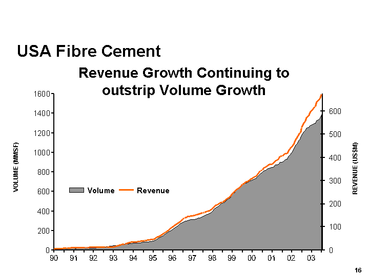 | USA Fibre Cement Revenue Growth Continuing to outstrip Volume Growth 0 200 400 600 800 1000 1200 1400 1600 90 91 92 93 94 95 96 97 98 99 00 01 02 03 VOLUME (MMSF) 0 100 200 300 400 500 600 REVENUE (US$M) Volume Revenue |
