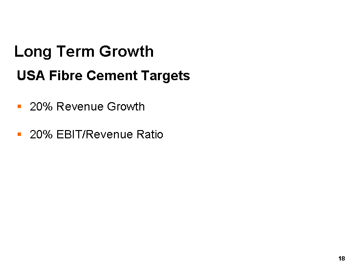 | Long Term Growth USA Fibre Cement Targets 20% Revenue Growth 20% EBIT/Revenue Ratio |