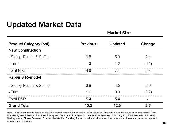 | Updated Market Data Market Size Market Size Market Size Product Category (bsf) Previous Updated Change New Construction - Siding, Fascia & Soffits 3.5 5.9 2.4 - Trim 1.3 1.2 (0.1) Total New 4.8 7.1 2.3 Repair & Remodel - Siding, Fascia & Soffits 3.9 4.5 0.6 - Trim 1.6 0.9 (0.7) Total R&R 5.4 5.4 - Grand Total 10.2 12.5 2.3 Note - This information is based on the latest market survey data collected and analysed by James Hardie and is based on source material from the NAHB, NAHB Builder Practices Survey and Consumer Practices Survey, Ducker Research Company Inc. 2002 Analysis of Exterior Wall systems, Ciprus Research Exterior Residential Cladding Report, combined with James Hardie estimates based on its own surveys and management estimates. |