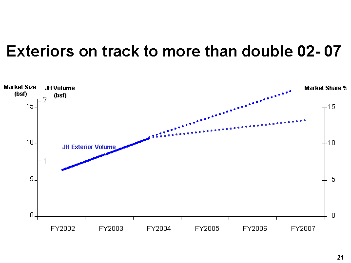 | Exteriors on track to more than double 02- 07 Market Size (bsf) Market Share % 0 5 10 15 FY2002 FY2003 FY2004 FY2005 FY2006 FY2007 0 5 10 15 Market Share 1 2 JH Volume (bsf) |