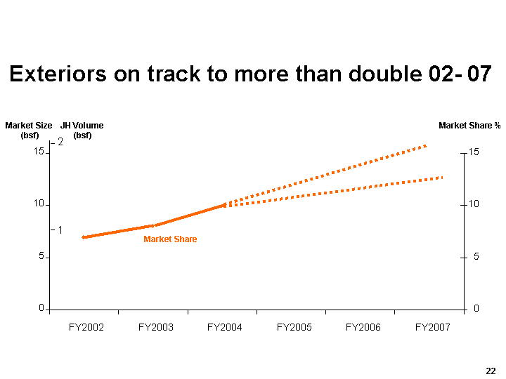 | Exteriors on track to more than double 02- 07 Market Size (bsf) Market Share % 0 5 10 15 FY2002 FY2003 FY2004 FY2005 FY2006 FY2007 0 5 10 15 Market Size 1 2 JH Volume (bsf) |