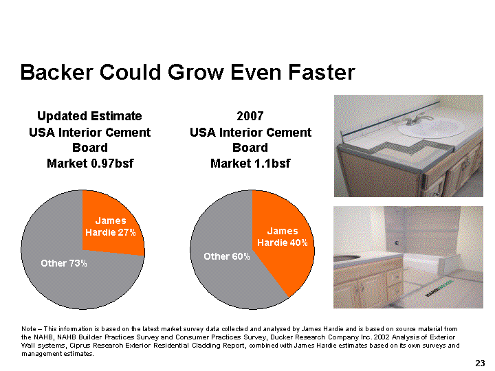 | Backer Could Grow Even Faster Updated Estimate USA Interior Cement Board Market 0.97bsf 2007 USA Interior Cement Board Market 1.1bsf Note - This information is based on the latest market survey data collected and analysed by James Hardie and is based on source material from the NAHB, NAHB Builder Practices Survey and Consumer Practices Survey, Ducker Research Company Inc. 2002 Analysis of Exterior Wall systems, Ciprus Research Exterior Residential Cladding Report, combined with James Hardie estimates based on its own surveys and management estimates. James Hardie 27% Other 73% James Hardie 40% Other 60% |