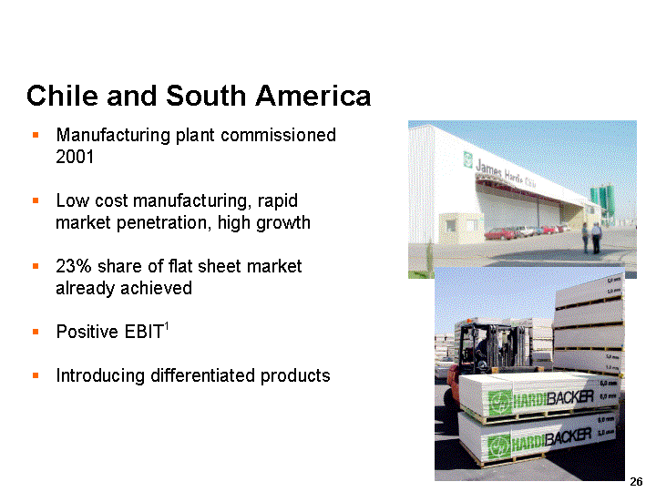 | Chile and South America Manufacturing plant commissioned 2001 Low cost manufacturing, rapid market penetration, high growth 23% share of flat sheet market already achieved Positive EBIT1 Introducing differentiated products |