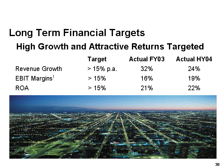 | High Growth and Attractive Returns Targeted Long Term Financial Targets Target Actual FY03 Actual HY04 Revenue Growth > 15% p.a. 32% 24% EBIT Margins1 > 15% 16% 19% ROA > 15% 21% 22% |