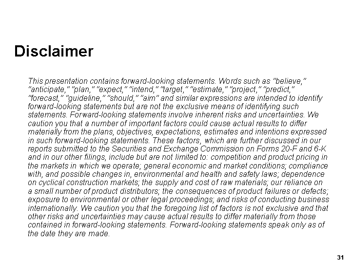 | Disclaimer This presentation contains forward-looking statements. Words such as "believe,'' "anticipate,'' "plan,'' "expect,'' "intend,'' "target,'' "estimate,'' "project,'' "predict,'' "forecast,'' "guideline,'' "should,'' "aim'' and similar expressions are intended to identify forward-looking statements but are not the exclusive means of identifying such statements. Forward-looking statements involve inherent risks and uncertainties. We caution you that a number of important factors could cause actual results to differ materially from the plans, objectives, expectations, estimates and intentions expressed in such forward-looking statements. These factors, which are further discussed in our reports submitted to the Securities and Exchange Commission on Forms 20-F and 6-K and in our other filings, include but are not limited to: competition and product pricing in the markets in which we operate; general economic and market conditions; compliance with, and possible changes in, environmental and health and safety laws; dependence on cyclical construction markets; the supply and cost of raw materials; our reliance on a small number of product distributors; the consequences of product failures or defects; exposure to environmental or other legal proceedings; and risks of conducting business internationally. We caution you that the foregoing list of factors is not exclusive and that other risks and uncertainties may cause actual results to differ materially from those contained in forward-looking statements. Forward-looking statements speak only as of the date they are made. |