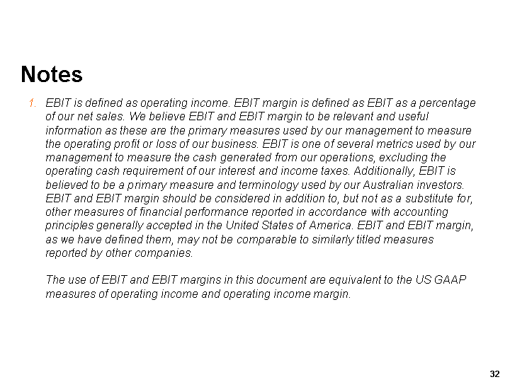 | Notes EBIT is defined as operating income. EBIT margin is defined as EBIT as a percentage of our net sales. We believe EBIT and EBIT margin to be relevant and useful information as these are the primary measures used by our management to measure the operating profit or loss of our business. EBIT is one of several metrics used by our management to measure the cash generated from our operations, excluding the operating cash requirement of our interest and income taxes. Additionally, EBIT is believed to be a primary measure and terminology used by our Australian investors. EBIT and EBIT margin should be considered in addition to, but not as a substitute for, other measures of financial performance reported in accordance with accounting principles generally accepted in the United States of America. EBIT and EBIT margin, as we have defined them, may not be comparable to similarly titled measures reported by other companies. The use of EBIT and EBIT margins in this document are equivalent to the US GAAP measures of operating income and operating income margin. |