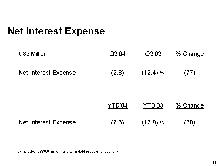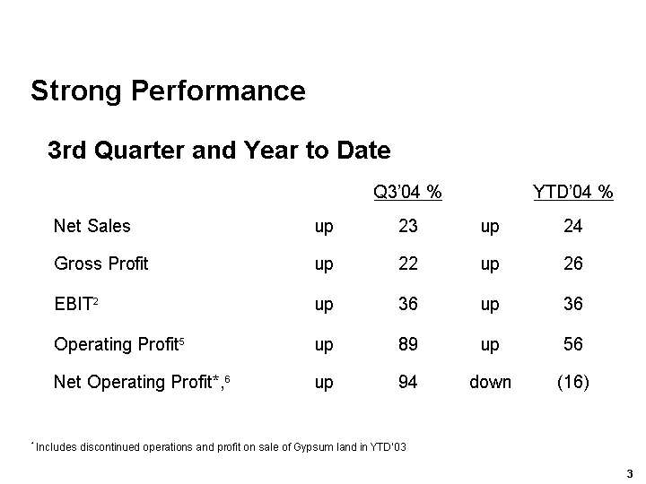 Net operating profit including discontinued operations in the 3rd quarter was US$30.1 million. Year-to-date, net operating profit including discontinued operations is US$97.6 million, down slightly on the same period last year that included a profit of US$55.6 million related to the sale of Las Vegas land associated with our former Gypsum business.