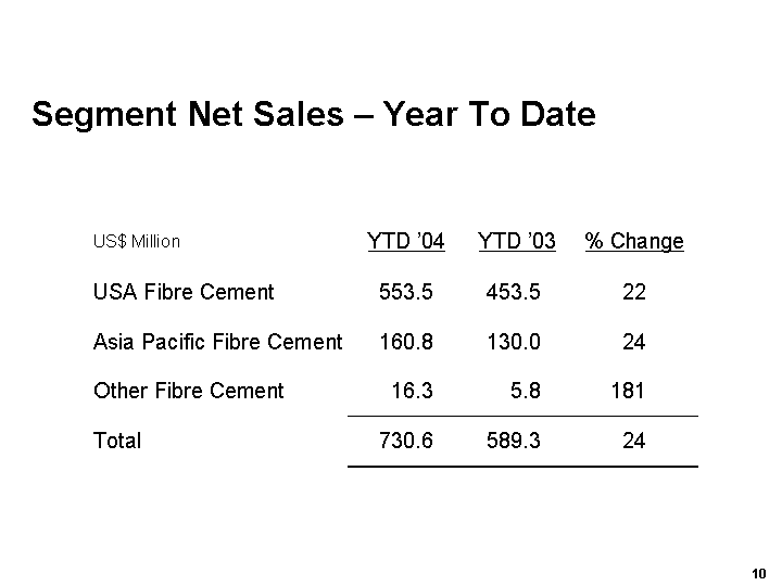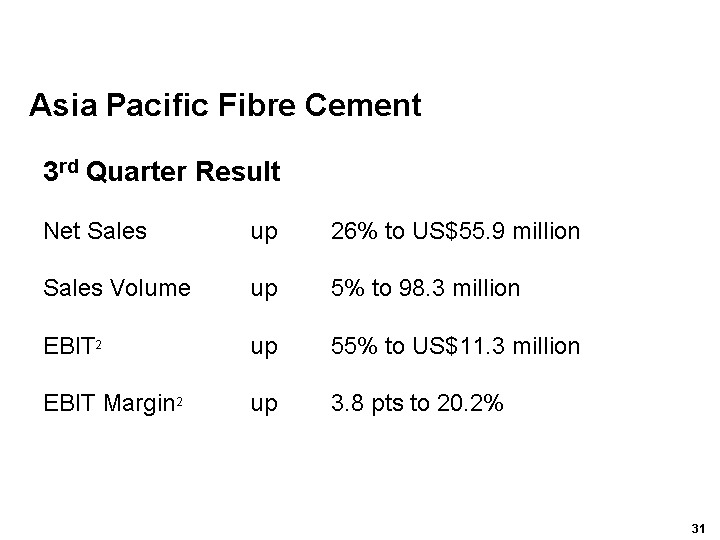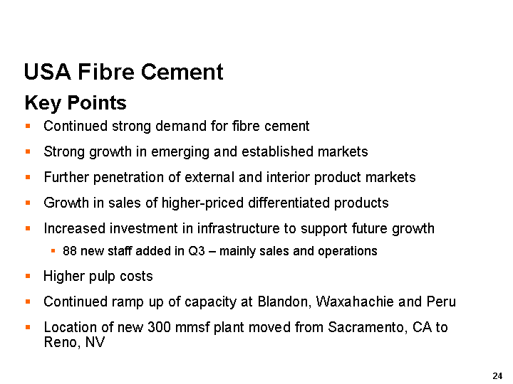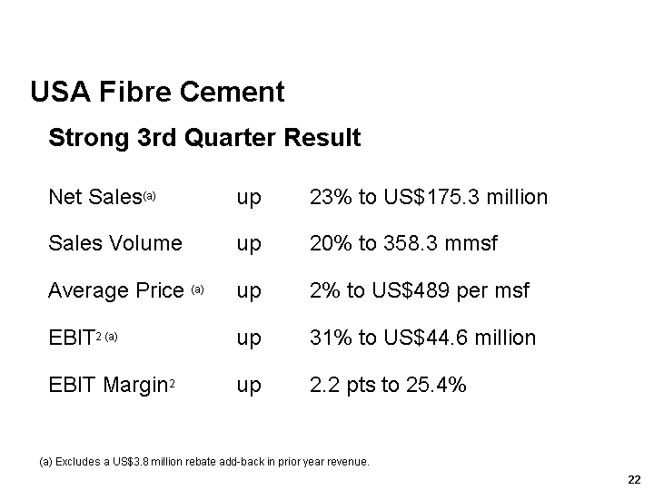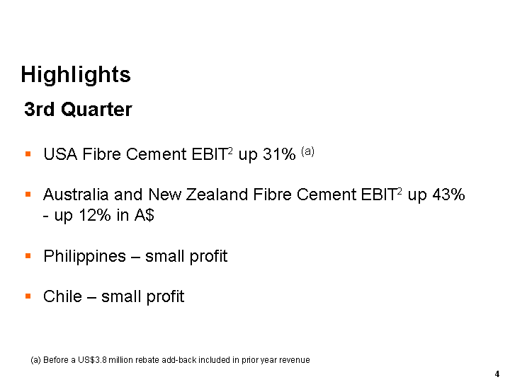 James Hardies CEO, Peter Macdonald said: The third quarter results have cemented the strong performance of the first half and the growth momentum evident in the first nine months is continuing into the fourth quarter. We are on track for a solid and satisfactory full year result.