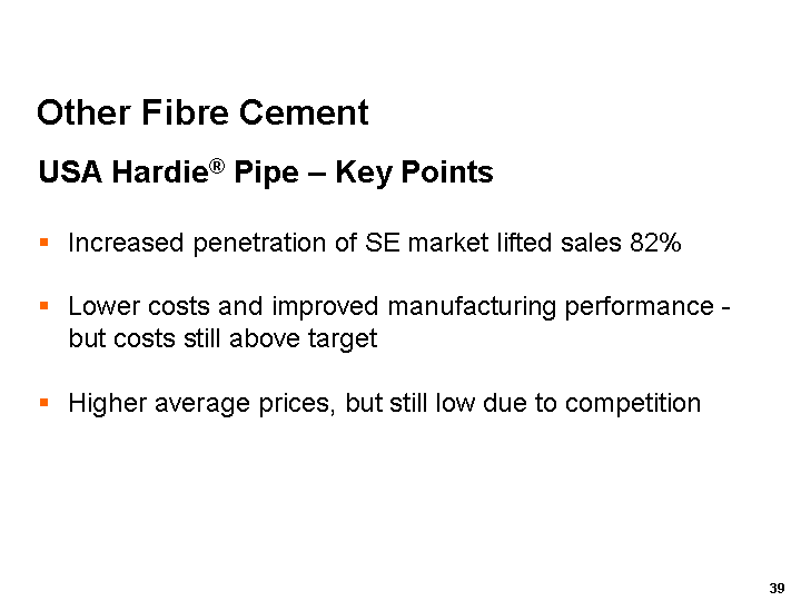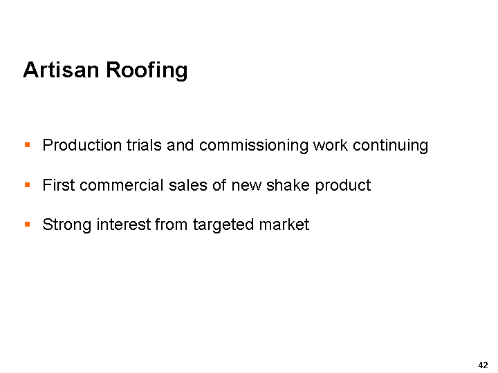 The first commercial sales of our new generation of fibre cement roofing products were made during the quarter, and production trials and commissioning work at the pilot plant in California are continuing.