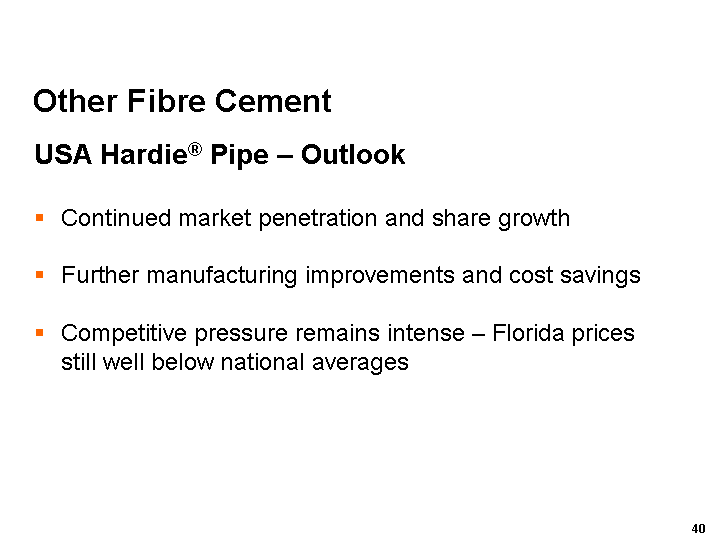In Australia and New Zealand, the renovations segment is expected to remain relatively healthy over the short term, but new housing activity in Australia is expected to be softer over the same period. Market share gains are expected for differentiated products such as Linea® weatherboards. Profitability is expected to further improve due to increased sales of higher-priced differentiated products and manufacturing efficiency gains.