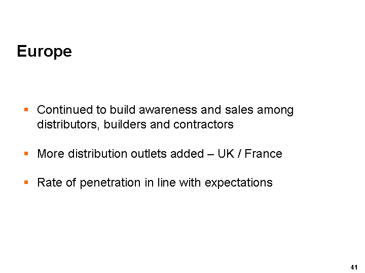 Our expansion into Europe is tracking in line with expectations since the business became operational in the first quarter. We continued to add distribution outlets in the U.K. and France and expand the businesss sales and marketing operations during the quarter, helping to build awareness among distributors, builders and contractors.