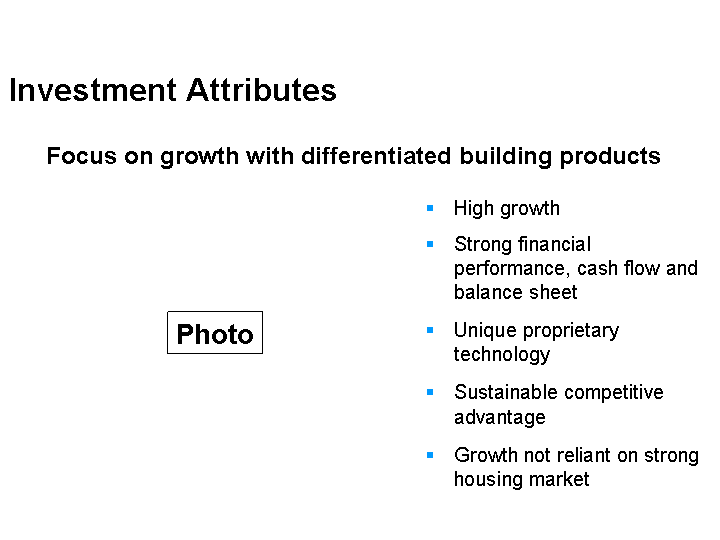 | Investment Attributes Focus on growth with differentiated building products High growth Strong financial performance, cash flow and balance sheet Unique proprietary technology Sustainable competitive advantage Growth not reliant on strong housing market Investment Attributes Photo |