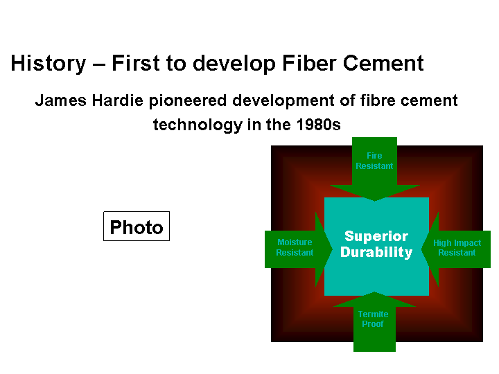 | History - First to develop Fiber Cement James Hardie pioneered development of fibre cement technology in the 1980s Superior Durability Fire Resistant High Impact Resistant Termite Proof Moisture Resistant Photo |