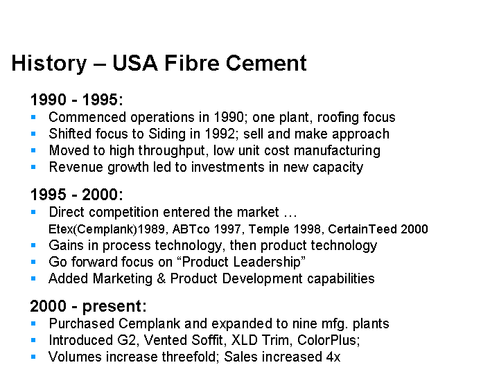 | History - USA Fibre Cement 1990 - 1995: Commenced operations in 1990; one plant, roofing focus Shifted focus to Siding in 1992; sell and make approach Moved to high throughput, low unit cost manufacturing Revenue growth led to investments in new capacity 1995 - 2000: Direct competition entered the market ... Etex(Cemplank)1989, ABTco 1997, Temple 1998, CertainTeed 2000 Gains in process technology, then product technology Go forward focus on "Product Leadership" Added Marketing & Product Development capabilities 2000 - present: Purchased Cemplank and expanded to nine mfg. plants Introduced G2, Vented Soffit, XLD Trim, ColorPlus; Volumes increase threefold; Sales increased 4x |