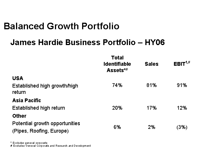 | Balanced Growth Portfolio * Excludes general corporate # Excludes General Corporate and Research and Development Total Identifiable Assets*# Sales EBIT1,# USA Established high growth/high return 74% 81% 91% Asia Pacific Established high return 20% 17% 12% Other Potential growth opportunities (Pipes, Roofing, Europe) 6% 2% (3%) James Hardie Business Portfolio - HY06 |