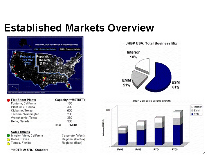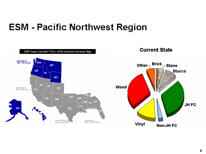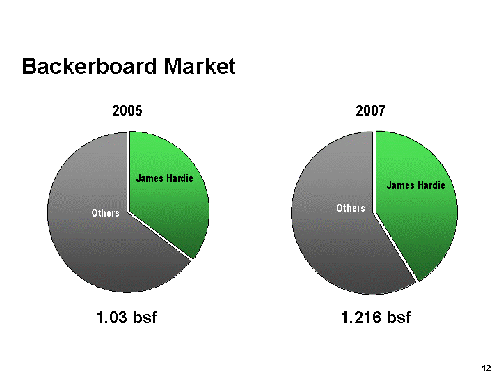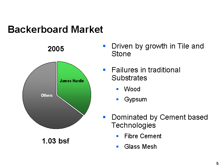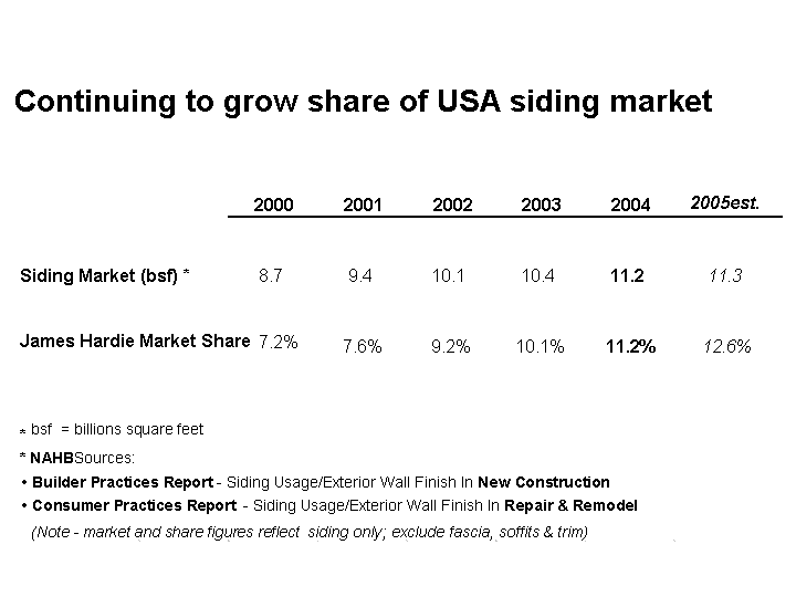 | Continuing to grow share of USA siding market 2000 2001 2002 2003 2004 2005est. Siding Market (bsf) * 8.7 9.4 10.1 10.4 11.2 11.3 James Hardie Market Share 7.2% 7.6% 9.2% 10.1% 11.2% 12.6% * bsf = billions square feet * NAHB Sources: Builder Practices Report - Siding Usage/Exterior Wall Finish In New Construction Consumer Practices Report - Siding Usage/Exterior Wall Finish In Repair & Remodel (Note - market and share figures reflect siding only ; exclude fascia, soffits & trim) |