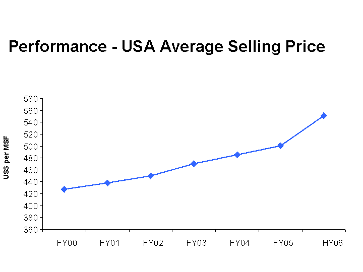 | US$ per MSF 360 380 400 420 440 460 480 500 520 540 560 580 FY00 FY01 FY02 FY03 FY04 FY05 HY06 Performance - USA Average Selling Price |