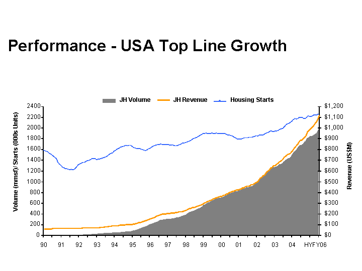 | 0 200 400 600 800 1000 1200 1400 1600 1800 2000 2200 2400 90 91 92 93 94 95 96 97 98 99 00 01 02 03 04 HYFY06 Volume (mmsf)/ Starts (000s Units) $0 $100 $200 $300 $400 $500 $600 $700 $800 $900 $1,000 $1,100 $1,200 Revenue (US$M) JH Volume JH Revenue Housing Starts Performance - USA Top Line Growth |
