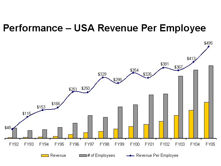 | Performance - USA Revenue Per Employee $495 $48 $115 $153 $166 $251 $250 $329 $298 $354 $326 $381 $367 $413 FY92 FY93 FY94 FY95 FY96 FY97 FY98 FY99 FY00 FY01 FY02 FY03 FY04 FY05 Revenue # of Employees Revenue Per Employee |