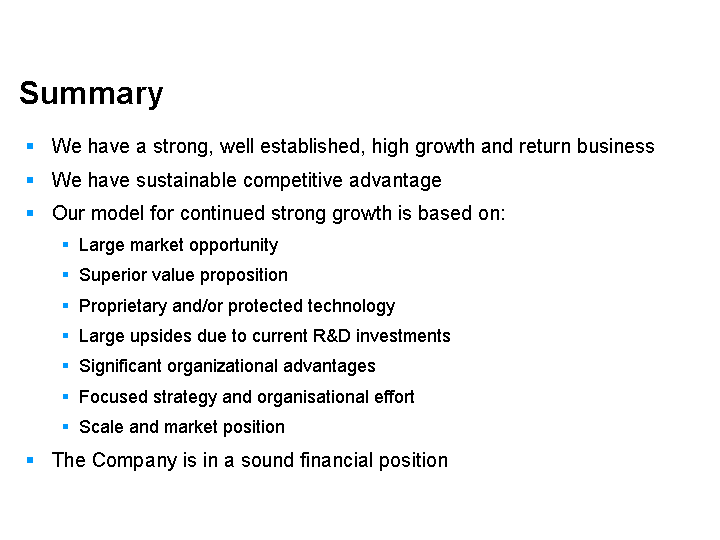 | Summary We have a strong, well established, high growth and return business We have sustainable competitive advantage Our model for continued strong growth is based on: Large market opportunity Superior value proposition Proprietary and/or protected technology Large upsides due to current R&D investments Significant organizational advantages Focused strategy and organisational effort Scale and market position The Company is in a sound financial position |