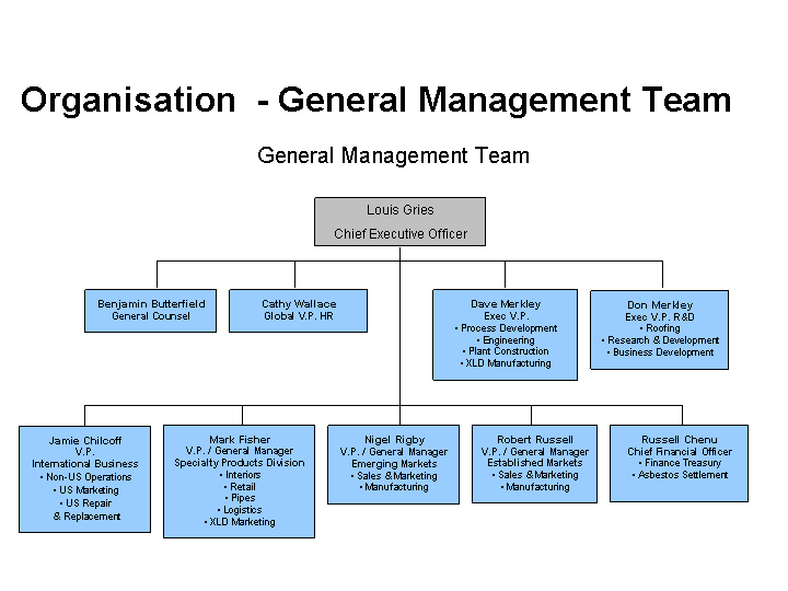 | Organisation - General Management Team Louis Gries Chief Executive Officer Russell Chenu Chief Financial Officer Finance Treasury Asbestos Settlement Benjamin Butterfield General Counsel Cathy Wallace Global V.P. HR Dave Merkley Exec V.P. Process Development Engineering Plant Construction XLD Manufacturing Don Merkley Exec V.P. R&D Roofing Research & Development Business Development Jamie Chilcoff V.P. International Business Non-US Operations US Marketing US Repair & Replacement Mark Fisher V.P. / General Manager Specialty Products Division Interiors Retail Pipes Logistics XLD Marketing Nigel Rigby V.P. / General Manager Emerging Markets Sales & Marketing Manufacturing Robert Russell V.P. / General Manager Established Markets Sales & Marketing Manufacturing General Management Team |
