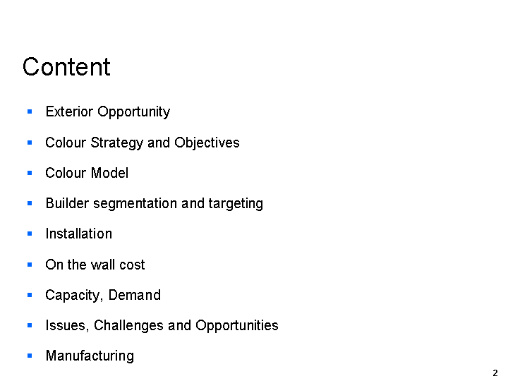 | Exterior Opportunity Colour Strategy and Objectives Colour Model Builder segmentation and targeting Installation On the wall cost Capacity, Demand Issues, Challenges and Opportunities Manufacturing Content |