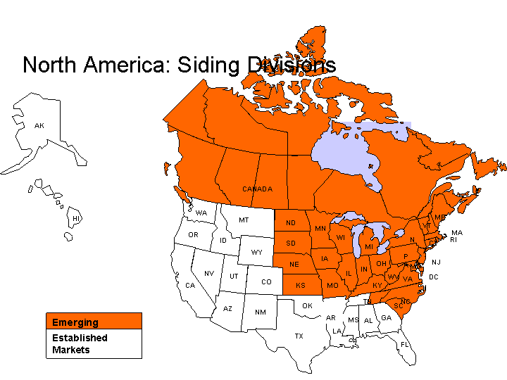 | AK HI VT CA NV AZ UT NM CO KS TX OK LA WI OH IA MS AR MO KY AL DC ND NE SD GA IL MN FL MI IN NJ NC SC MD WV VA N Y OR WA ID MT WY TN NC P A RI CT ME VT MA CANADA Emerging Markets Established Markets North America: Siding Divisions |