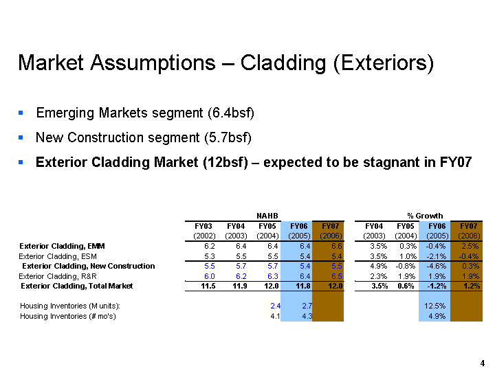 | Market Assumptions - Cladding (Exteriors) Emerging Markets segment (6.4bsf) New Construction segment (5.7bsf) Exterior Cladding Market (12bsf) - expected to be stagnant in FY07 NAHB % Growth FY03 FY04 FY05 FY06 FY07 FY04 FY05 FY06 FY07 (2002) (2003) (2004) (2005) (2006) (2003) (2004) (2005) (2006) Exterior Cladding, EMM 6.2 6.4 6.4 6.4 6.6 3.5% 0.3% - -0.4% 2.5% Exterior Cladding, ESM 5.3 5.5 5.5 5.4 5.4 3.5% 1.0% - -2.1% - -0.4% Exterior Cladding, New Construction 5.5 5.7 5.7 5.4 5.5 4.9% - -0.8% - -4.6% 0.3% Exterior Cladding, R&R 6.0 6.2 6.3 6.4 6.5 2.3% 1.9% 1.9% 1.9% Exterior Cladding, Total Market 11.5 11.9 12.0 11.8 12.0 3.5% 0.6% - -1.2% 1.2% Housing Inventories (M units): 2.4 2.7 12.5% Housing Inventories (# mo's) 4.1 4.3 4.9% |