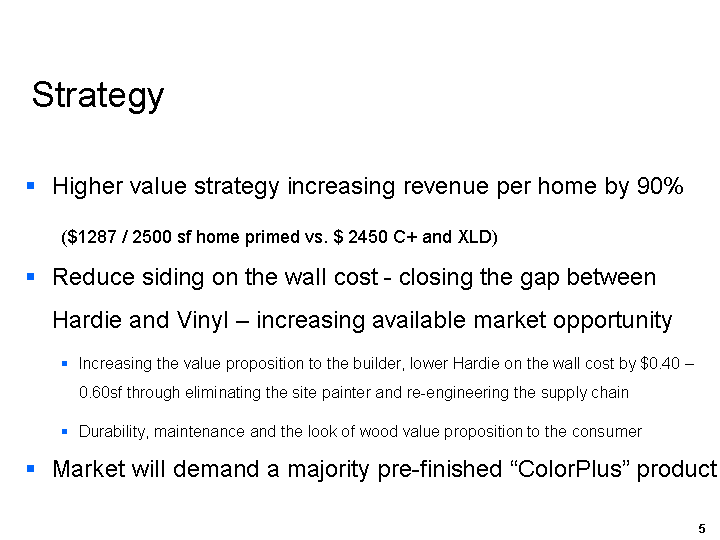 | Strategy Higher value strategy increasing revenue per home by 90% ($1287 / 2500 sf home primed vs. $ 2450 C+ and XLD) Reduce siding on the wall cost - closing the gap between Hardie and Vinyl - increasing available market opportunity Increasing the value proposition to the builder, lower Hardie on the wall cost by $0.40 - 0.60sf through eliminating the site painter and re-engineering the supply chain Durability, maintenance and the look of wood value proposition to the consumer Market will demand a majority pre-finished "ColorPlus" product |