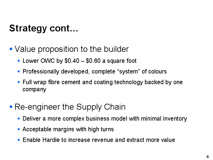 | Strategy cont... Value proposition to the builder Lower OWC by $0.40 - $0.60 a square foot Professionally developed, complete "system" of colours Full wrap fibre cement and coating technology backed by one company Re-engineer the Supply Chain Deliver a more complex business model with minimal inventory Acceptable margins with high turns Enable Hardie to increase revenue and extract more value |