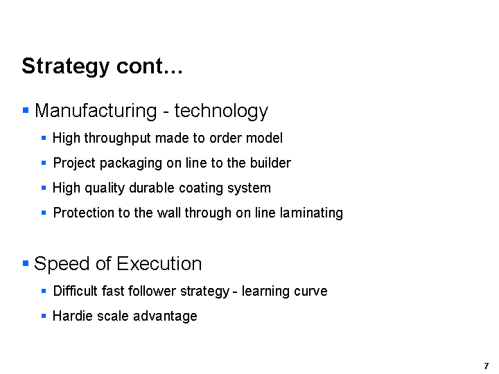 | Strategy cont... Manufacturing - technology High throughput made to order model Project packaging on line to the builder High quality durable coating system Protection to the wall through on line laminating Speed of Execution Difficult fast follower strategy - learning curve Hardie scale advantage |