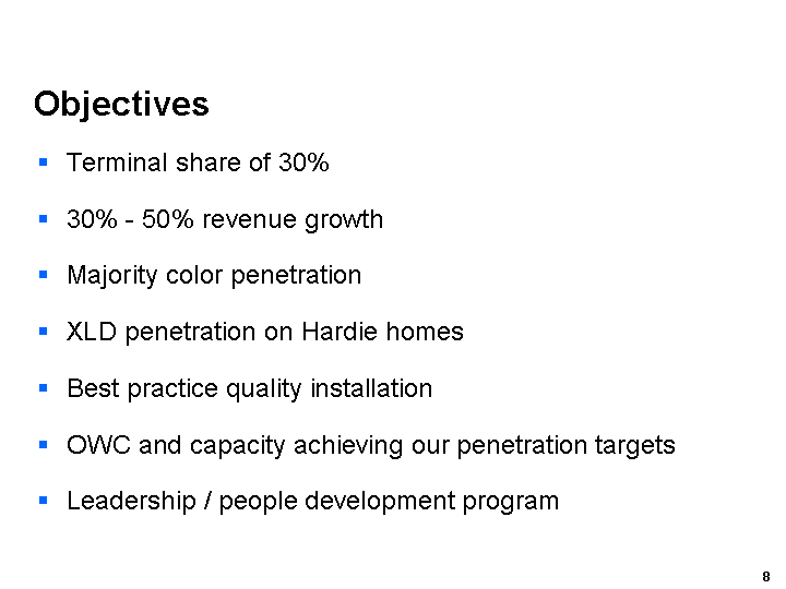 | Objectives Terminal share of 30% 30% - 50% revenue growth Majority color penetration XLD penetration on Hardie homes Best practice quality installation OWC and capacity achieving our penetration targets Leadership / people development program |