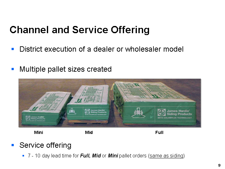 | Channel and Service Offering District execution of a dealer or wholesaler model Multiple pallet sizes created Service offering 7 - 10 day lead time for Full, Mid or Mini pallet orders (same as siding) Mini Mid Full |