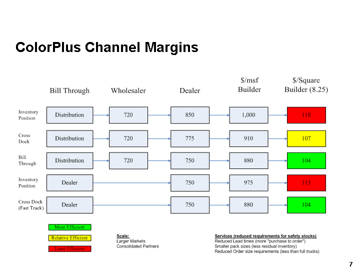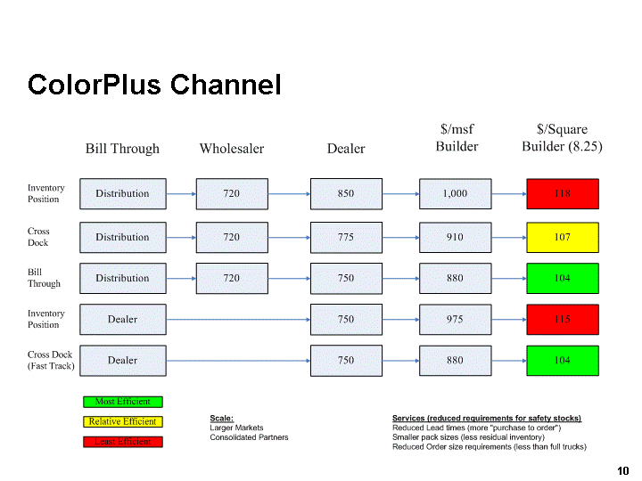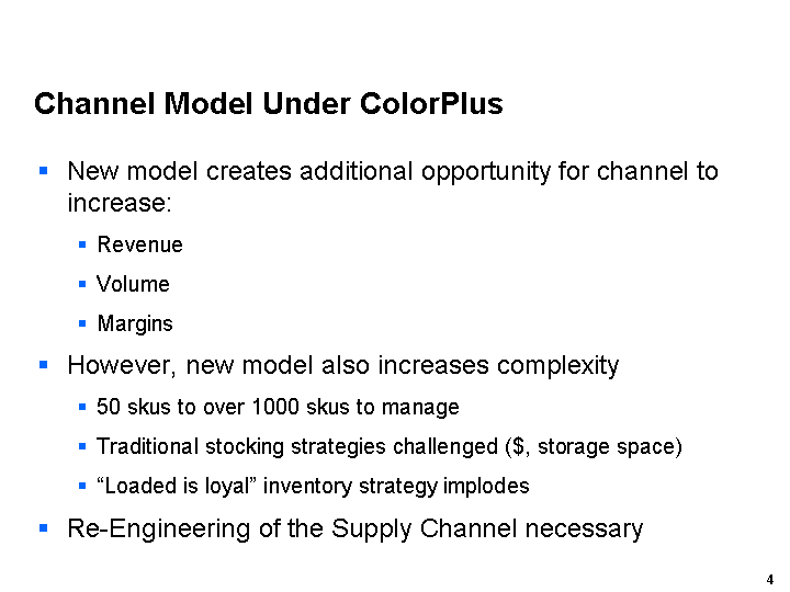 | Channel Model Under ColorPlus New model creates additional opportunity for channel to increase: Revenue Volume Margins However, new model also increases complexity 50 skus to over 1000 skus to manage Traditional stocking strategies challenged ($, storage space) "Loaded is loyal" inventory strategy implodes Re-Engineering of the Supply Channel necessary |