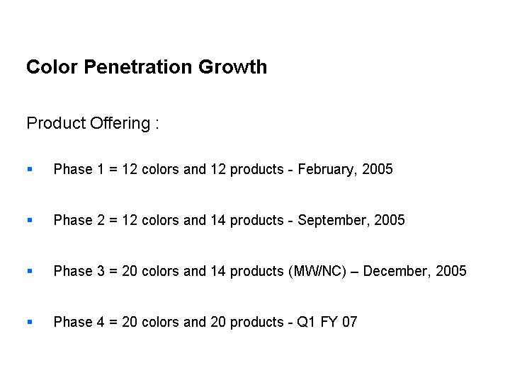 | Color Penetration Growth Product Offering : Phase 1 = 12 colors and 12 products - February, 2005 Phase 2 = 12 colors and 14 products - September, 2005 Phase 3 = 20 colors and 14 products (MW/NC) - December, 2005 Phase 4 = 20 colors and 20 products - Q1 FY 07 |