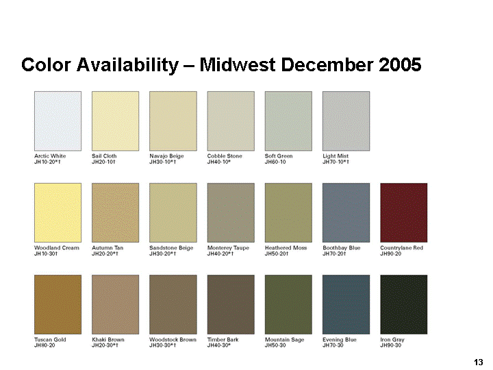 | Phase 1 Color Offering Sail Cloth Navajo Beige Monterey Taupe Arctic White Autumn Tan Sandstone Beige Heathered Moss Woodland Cream Khaki Brown Woodstock Brown Boothbay Blue Various Harditrim(r) and Hardisoffit(r) products available in Sail Cloth, Arctic White, and Navajo Beige Various Hardiplank(r) products available in ALL 12 colors. |