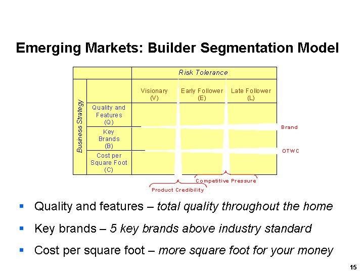 | Emerging Markets: Builder Segmentation Model Quality and features - total quality throughout the home Key brands - 5 key brands above industry standard Cost per square foot - more square foot for your money Cost per square foot - more square foot for your money Cost per square foot - more square foot for your money Cost per square foot - more square foot for your money |