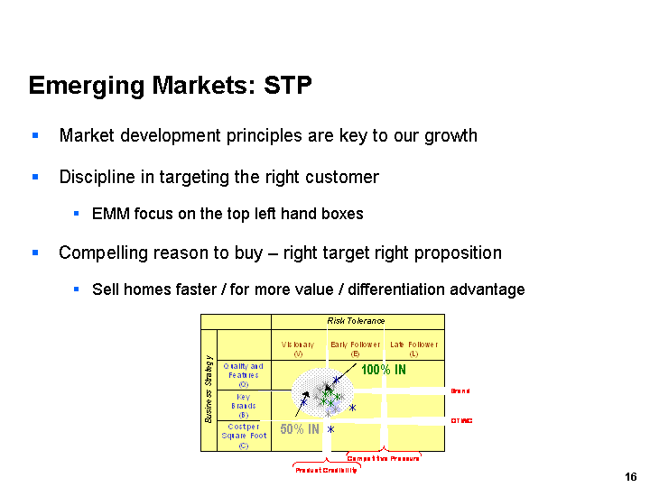 | Emerging Markets: STP Market development principles are key to our growth Discipline in targeting the right customer EMM focus on the top left hand boxes Compelling reason to buy - right target right proposition Sell homes faster / for more value / differentiation advantage Sell homes faster / for more value / differentiation advantage Sell homes faster / for more value / differentiation advantage Sell homes faster / for more value / differentiation advantage Sell homes faster / for more value / differentiation advantage Sell homes faster / for more value / differentiation advantage 50% IN * 100% IN * * * * * * * * * * * * * * * * * |