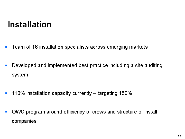 | Installation Team of 18 installation specialists across emerging markets Developed and implemented best practice including a site auditing system 110% installation capacity currently - targeting 150% OWC program around efficiency of crews and structure of install companies |