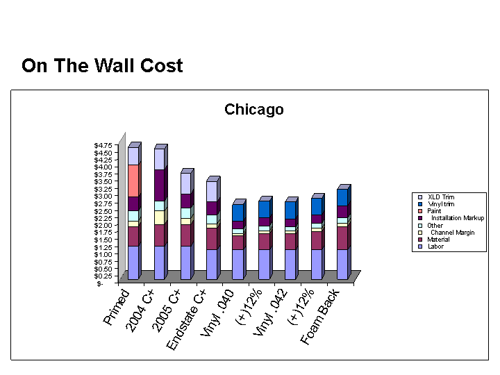 | On The Wall Cost $- $0.25 $0.50 $0.75 $1.00 $1.25 $1.50 $1.75 $2.00 $2.25 $2.50 $2.75 $3.00 $3.25 $3.50 $3.75 $4.00 $4.25 $4.50 $4.75 Primed 2004 C+ 2005 C+ Endstate C+ Vinyl .040 (+)12% Vinyl .042 (+)12% Foam Back Chicago XLD Trim Vinyl trim Paint Installation Markup Other Channel Margin Material Labor |