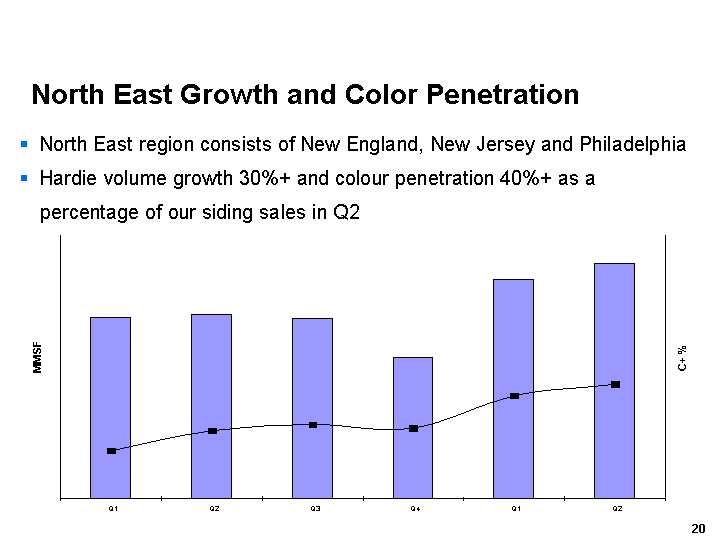 | North East Growth and Color Penetration North East region consists of New England, New Jersey and Philadelphia Hardie volume growth 30%+ and colour penetration 40%+ as a percentage of our siding sales in Q2 Q1 Q2 Q3 Q4 Q1 Q2 MMSF C+ % |
