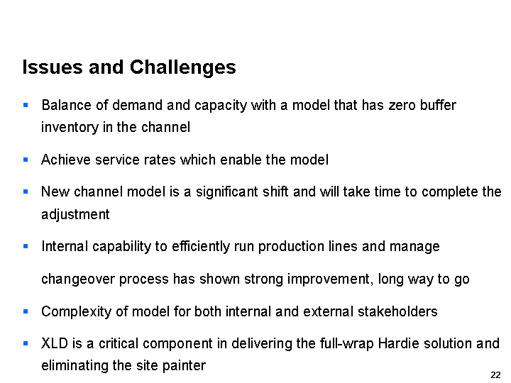 | Issues and Challenges Balance of demand and capacity with a model that has zero buffer inventory in the channel Achieve service rates which enable the model New channel model is a significant shift and will take time to complete the adjustment Internal capability to efficiently run production lines and manage changeover process has shown strong improvement, long way to go Complexity of model for both internal and external stakeholders XLD is a critical component in delivering the full-wrap Hardie solution and eliminating the site painter |