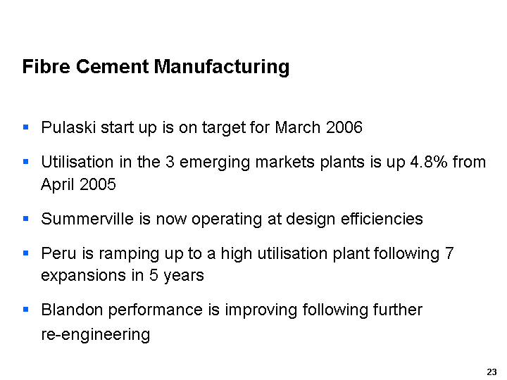 | Fibre Cement Manufacturing Pulaski start up is on target for March 2006 Utilisation in the 3 emerging markets plants is up 4.8% from April 2005 Summerville is now operating at design efficiencies Peru is ramping up to a high utilisation plant following 7 expansions in 5 years Blandon performance is improving following further re-engineering |