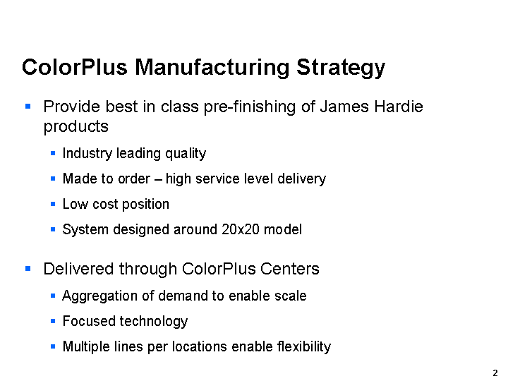 | ColorPlus Manufacturing Strategy Provide best in class pre-finishing of James Hardie products Industry leading quality Made to order - high service level delivery Low cost position System designed around 20x20 model Delivered through ColorPlus Centers Aggregation of demand to enable scale Focused technology Multiple lines per locations enable flexibility |